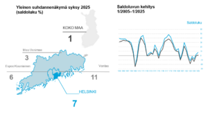 Helsingissä suhdanneodotukset ovat kohentuneet hieman muuta maata enemmän ja saldoluku nousi 7:ään viime syksyn 3:sta. Vuosi sitten keväällä saldoluku oli -8. Helsinkiläisistä pk-yrityksistä suhdannenäkymien paranemista seuraavan vuoden aikana ennakoi 30 prosenttia (syksyllä 29 %) ja heikkenemistä 23 syksyllä (keväällä 26 %). Yrityksistä 48 % yrityksistä arvioi suhdanteiden pysyvän ennallaan (syksyllä 46 %).